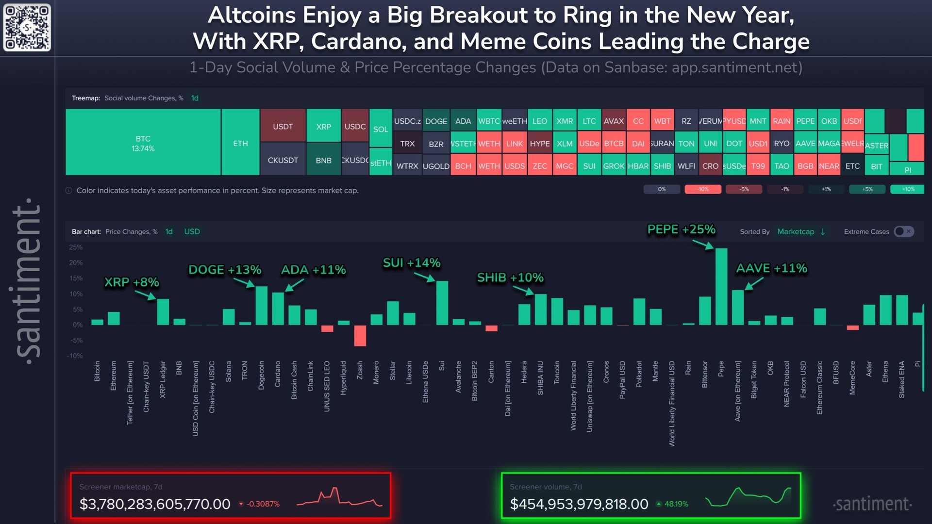 Возвращение биткоина выше $90K привлекло внимание СМИ. На выходных альткоины начали встречать 2026 год настоящим новогодним ралли. Среди заметных лидеров по росту цены за 24 часа: