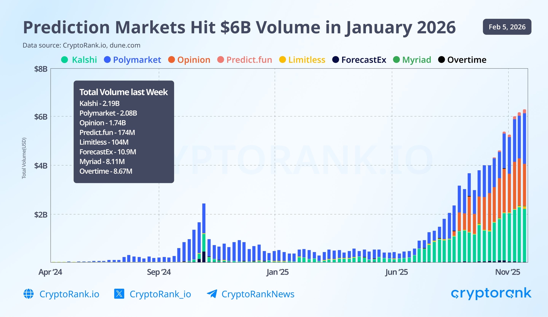 Ставка в 6 миллиардов долларов: рынки предсказаний оправдывают ожидания. Общий объем торгов на рынках предсказаний в январе 2026 года достиг 6,32 миллиарда долларов. Лидирует Kalshi с недельным объемом торгов в 2,19 миллиарда долларов, за ним следуют Polymarket с 2,08 миллиарда долларов и Opinion с 1,74 миллиарда долларов.