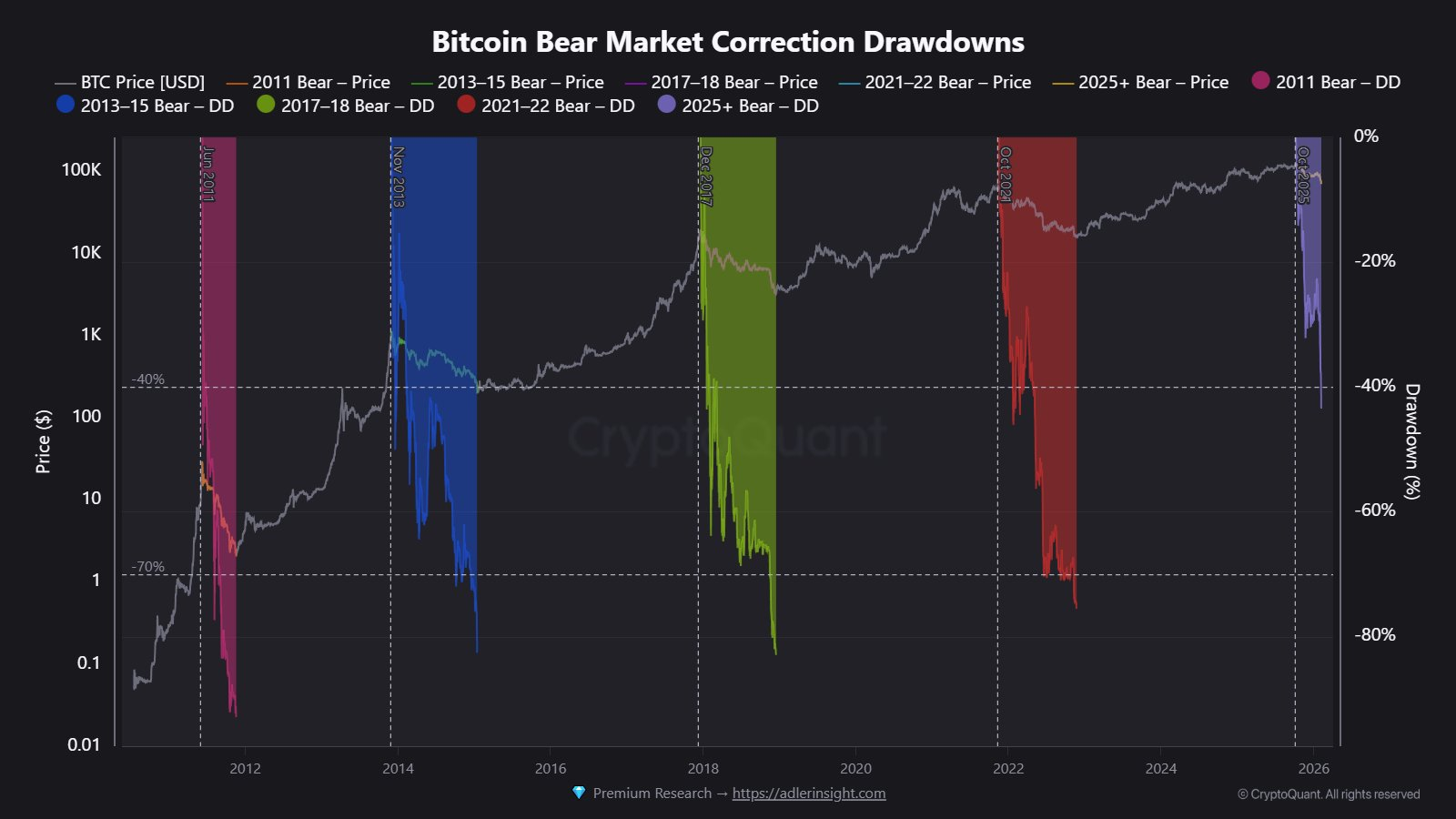 Биткоин на 50% ниже своего исторического максимума. Да, возможны более глубокие просадки (от -70% до -80%) по сравнению с предыдущими медвежьими рынками, но сейчас больший риск связан с временной капитуляцией, а не с ценой $BTC. Важно не только то, насколько низко упадет цена на биткоин, но и то, как долго она там продержится.