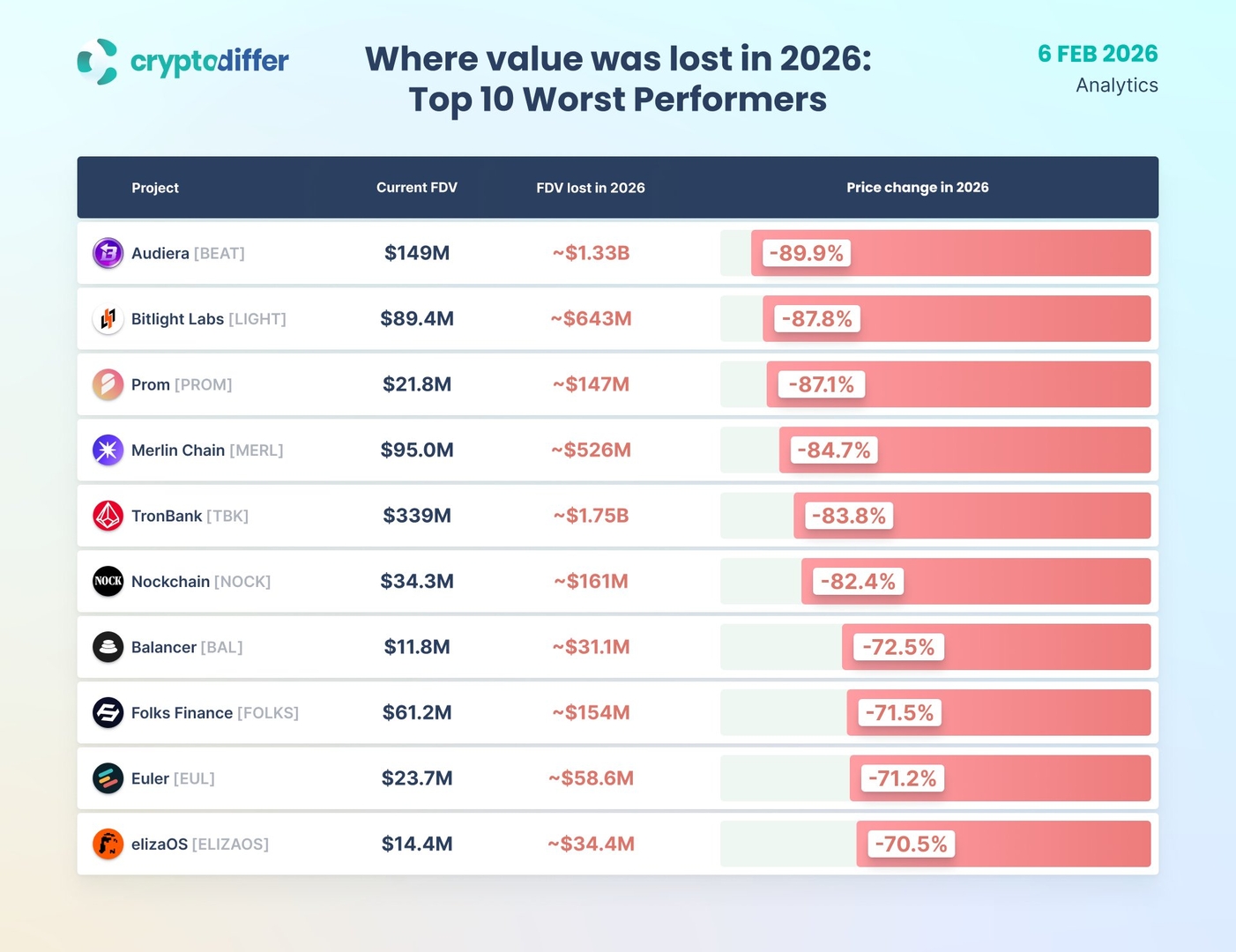 Первые недели 2026 года выдались тяжёлыми. Эти крипто проекты не просто откатились назад - они потеряли сотни миллионов долларов в виде FDV из-за исчезновения ликвидности. Самые большие потери: $BEAT, $LIGHT и $PROM.