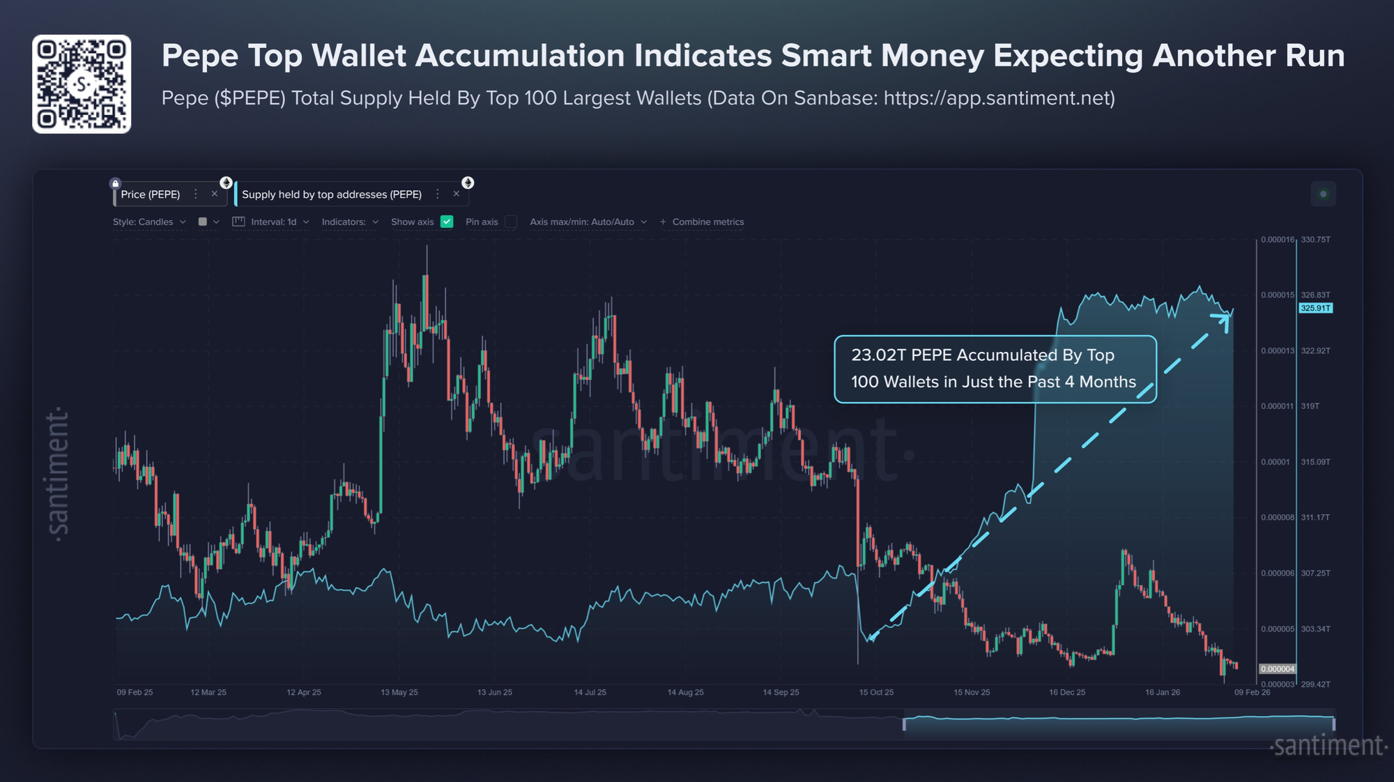 🐸 Рыночная капитализация Pepe упала примерно на 73% с момента достижения максимума чуть менее 9 месяцев назад. Однако четыре месяца назад, во время октябрьского обвала всего рынка, 100 крупнейших кошельков развернулись и за это время накопили 23,02 трлн $PEPE.