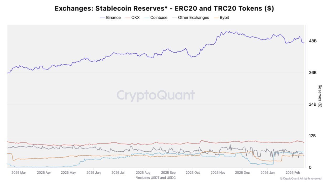 ⚡️ По данным CryptoQuant, на Binance хранится стейблкоинов на сумму 47,5 млрд долларов, что составляет примерно 65% от общей ликвидности биржевых стейблкоинов.
