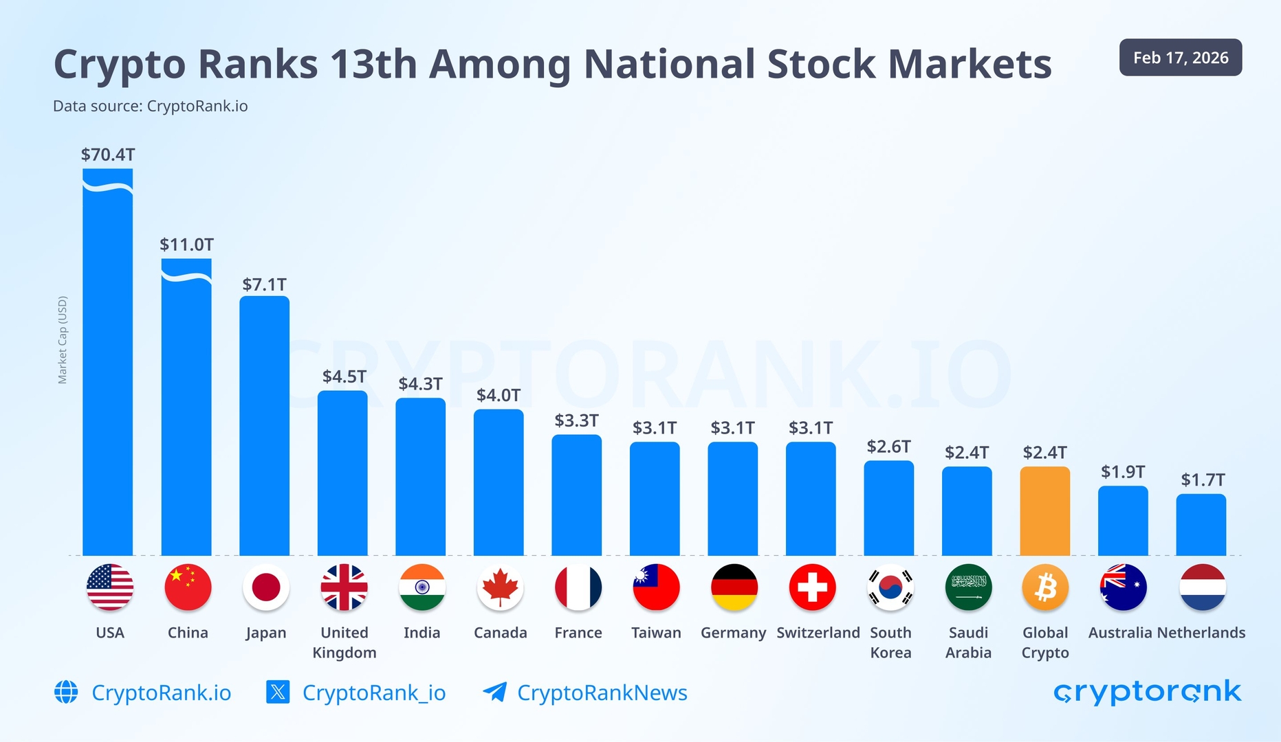 Если бы криптовалюта была фондовым рынком, она занимала бы 13-е место в мире по размеру.