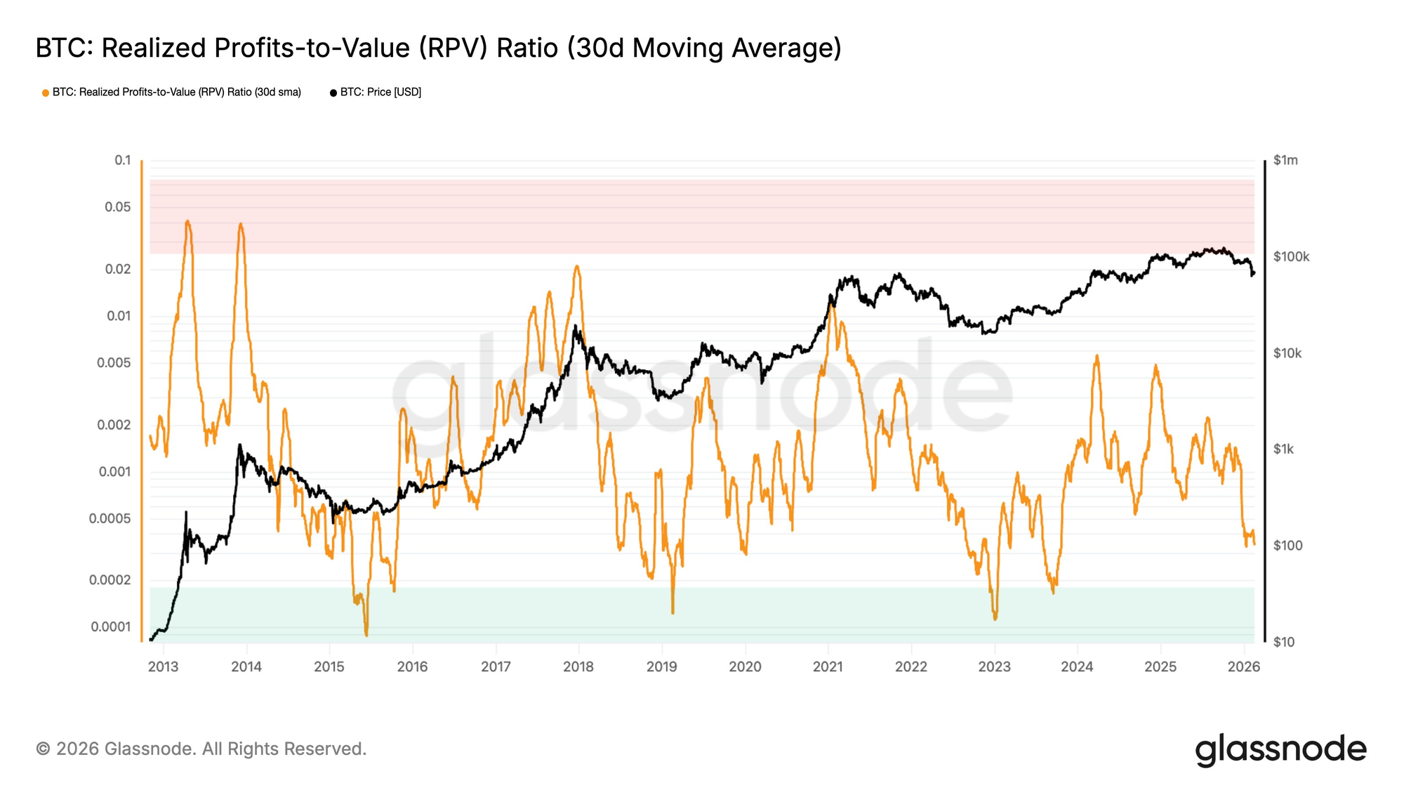 Показатель реализованной прибыли к стоимости (30-дневная скользящая средняя) для $BTC резко снизился, нивелировав большую часть предыдущего импульса к фиксации прибыли. Тем не менее он по-прежнему выше исторической полосы капитуляции. Это говорит о том, что фиксация прибыли замедляется, но масштабной капитуляции пока не происходит.