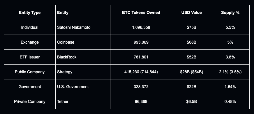 В число крупнейших держателей в каждой категории входят Coinbase, BlackRock, Strategy, правительство США и Tether, согласно Arkham.
