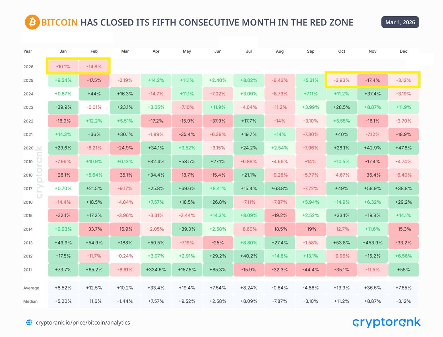 🚨Февраль завершился в минусе, и теперь у биткоина 5 убыточных месяцев подряд. Может ли март стать шестым убыточным месяцем для $BTC?