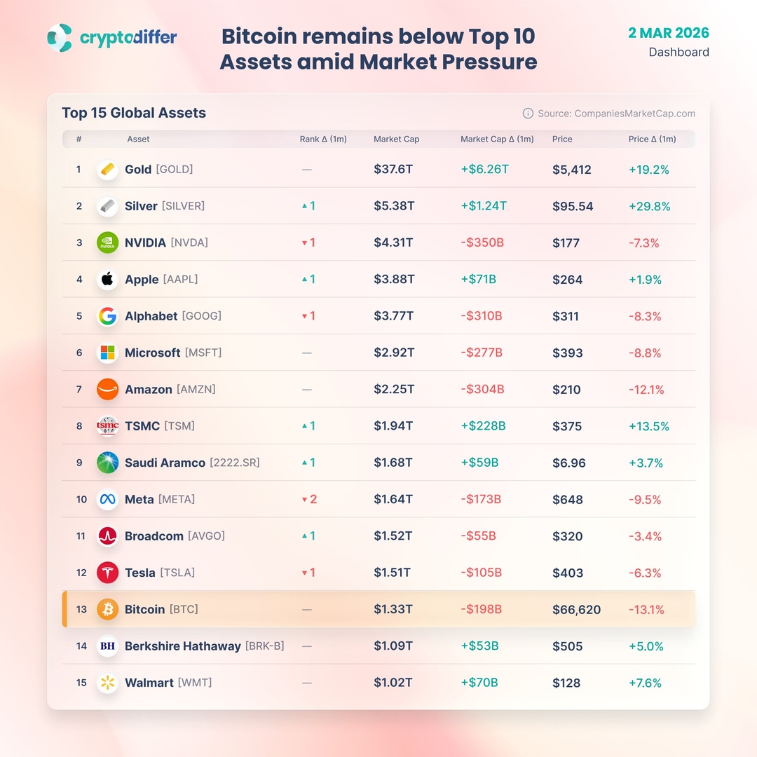 Биткоин по-прежнему не входит в десятку крупнейших мировых активов, несмотря на давление рынка.