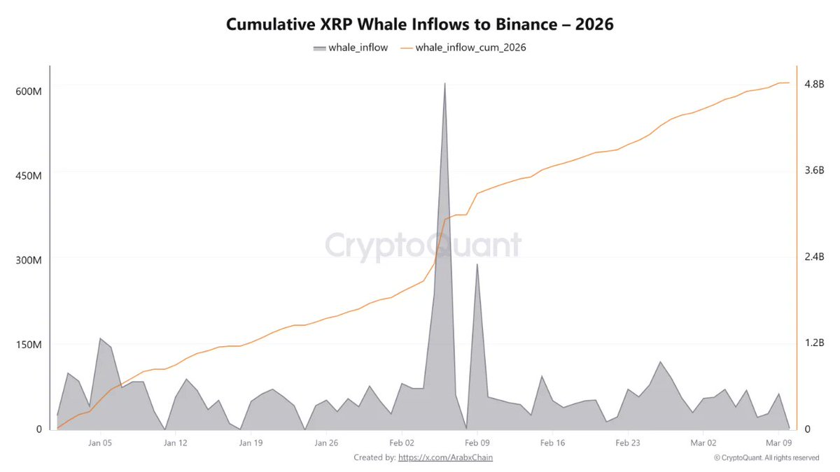 Данные CryptoQuant показывают, что в этом году количество крупных транзакций XRP-китов резко возросло, причем на нескольких крупных биржах наблюдались резкие скачки. Только на Binance за последние 10 дней было реализовано около 450 миллионов XRP.