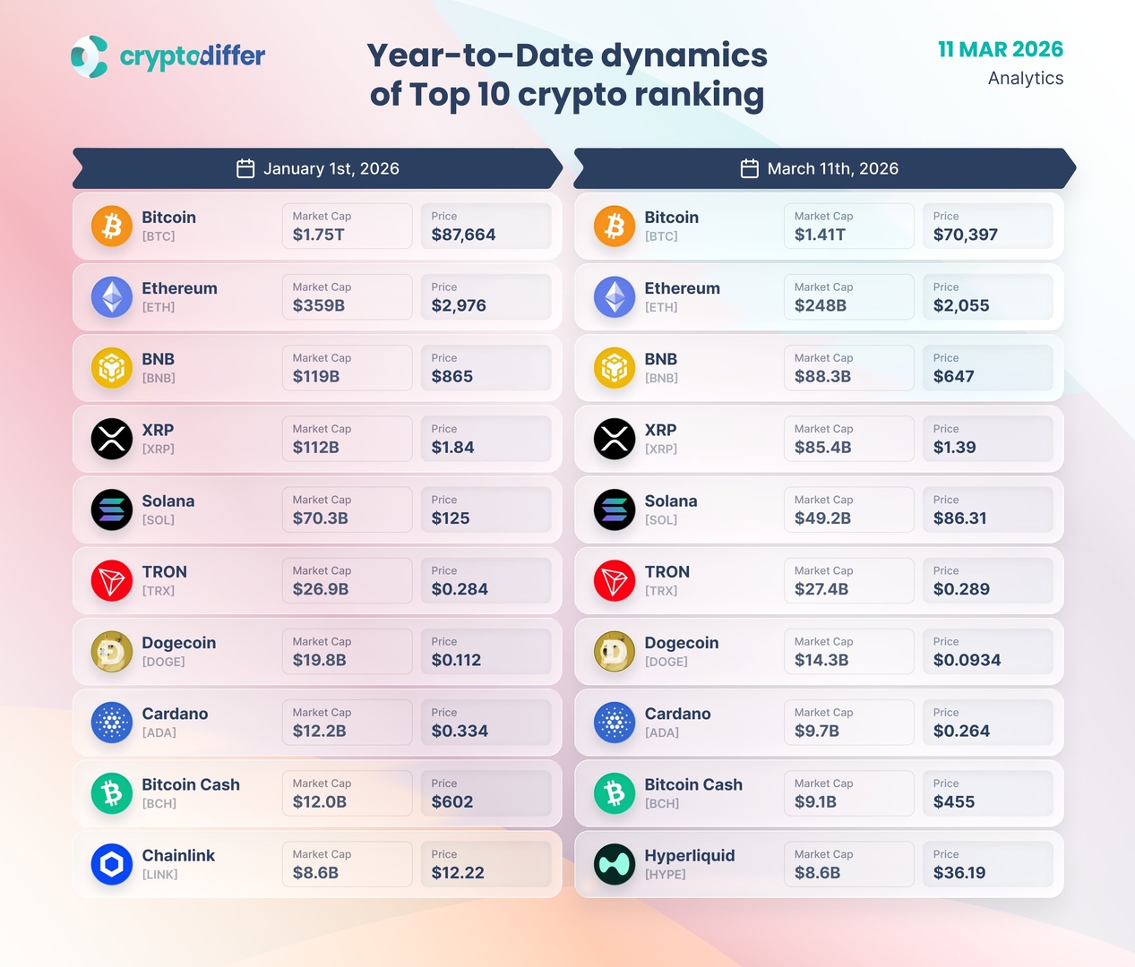 Несмотря на серьезную коррекцию рынка, в 2026 году топ-10 криптовалют практически не изменился. Единственным новичком стал Hyperliquid, который потеснил Chainlink в первой десятке.