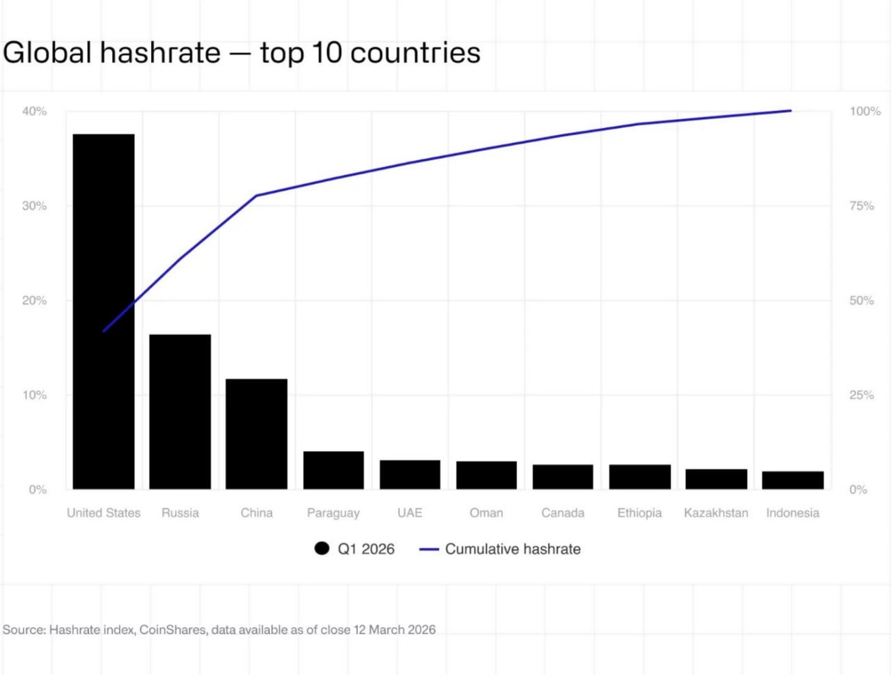 68% мощностей для майнинга биткоина сосредоточено в трёх странах: США, Китае и России.