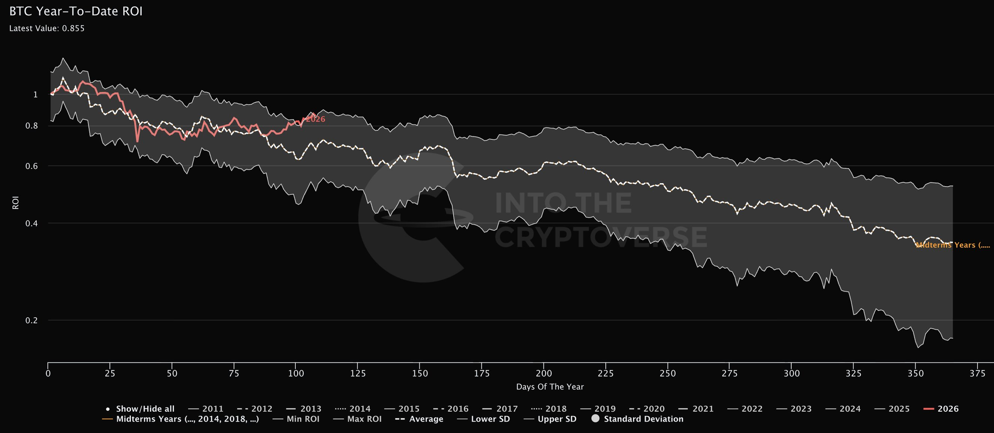 Окупаемость инвестиций в биткоин с начала года по сравнению со средним показателем за предыдущие периоды.