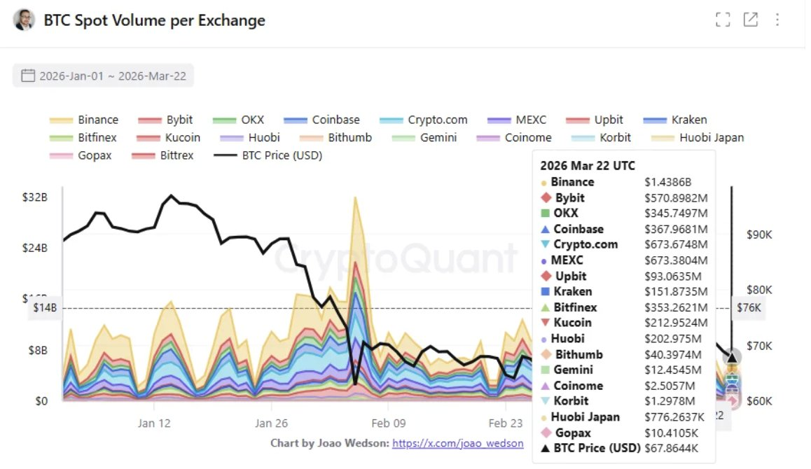 По данным на 22 марта 2026 года, в тройку лидеров по объёму спотовой торговли BTC входят: