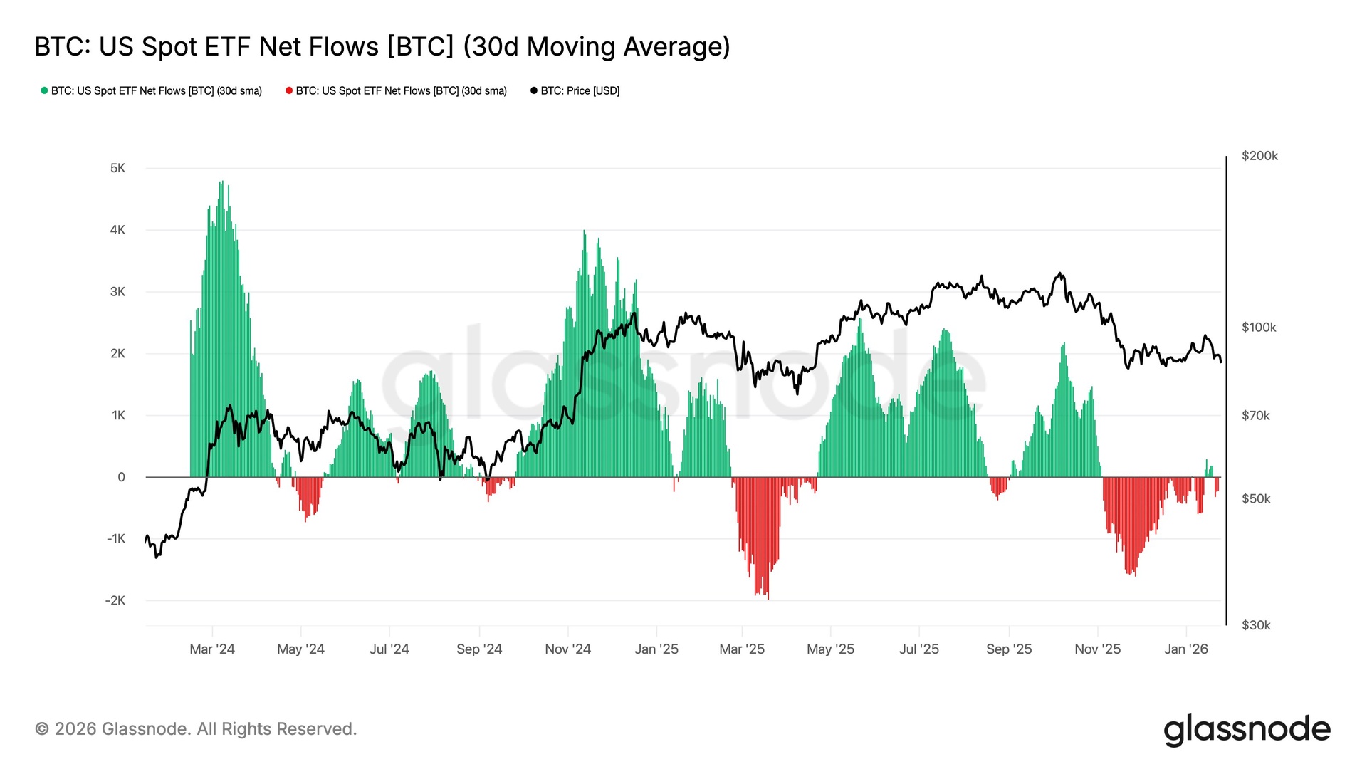30-дневная скользящая средняя чистого притока средств в спотовых ETF на биткоин и Ethereum остается отрицательной. Признаков восстановления спроса нет.