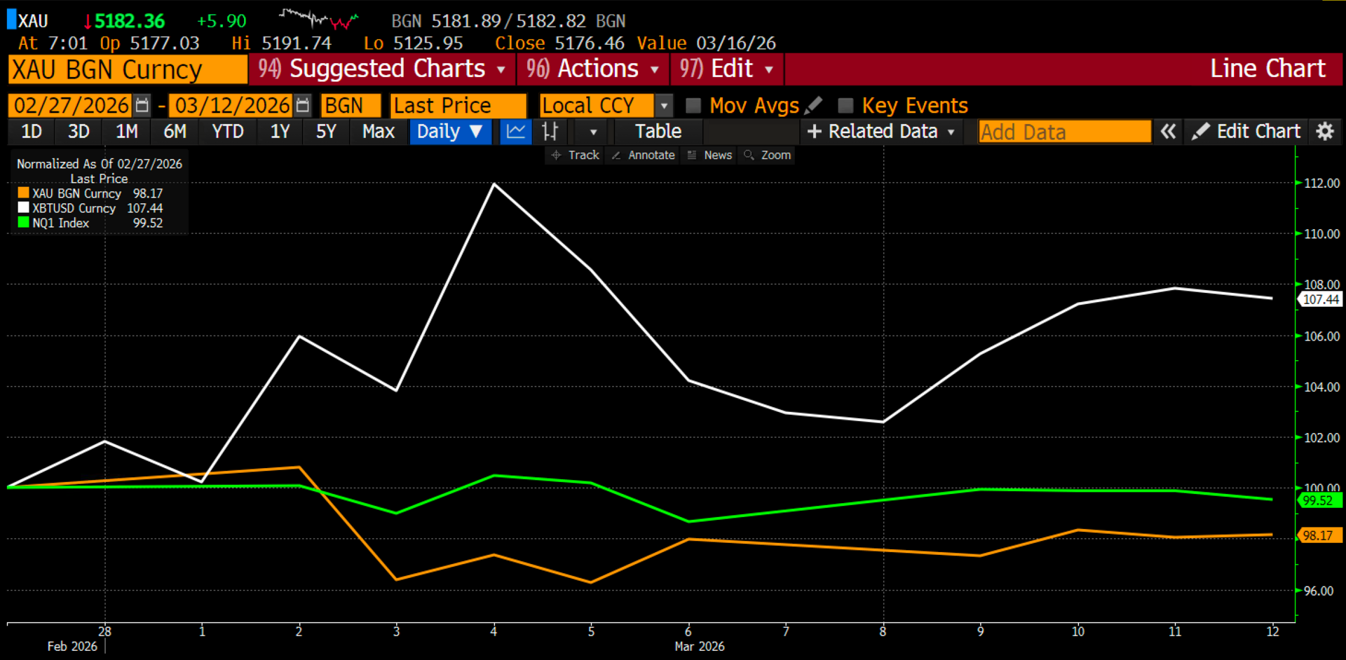 🔥 Биткоин превзошел по доходности традиционные активы с тех пор, как 28 февраля начался конфликт между США и Ираном. За этот период биткоин вырос примерно на 7%, в то время как золото подешевело примерно на 2%, а индекс Nasdaq-100 немного снизился.
