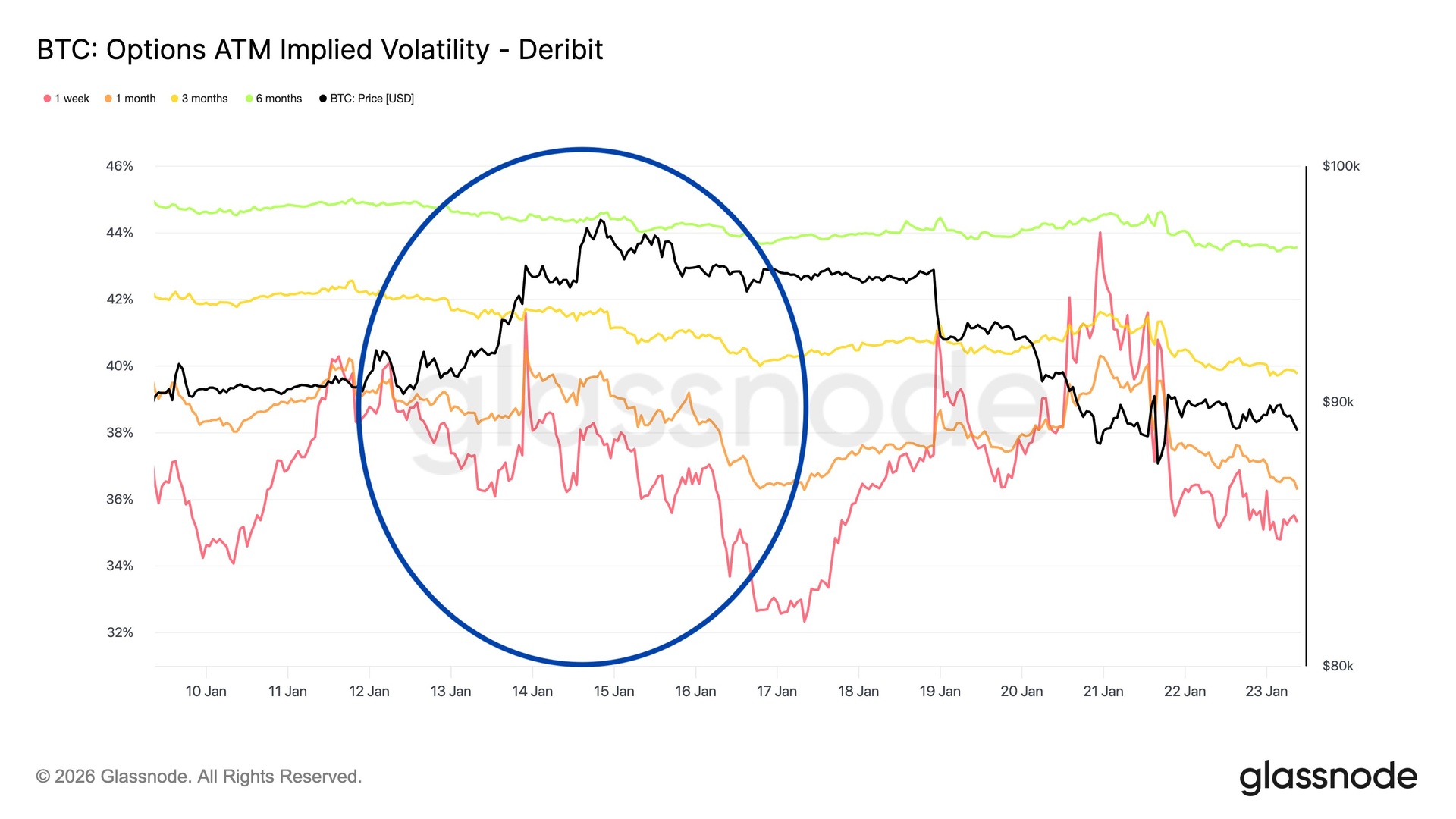Если посмотреть на подразумеваемую волатильность ATM, то мы увидим, что волатильность продавалась по мере роста цены на биткоин. Продавцы гамма-опционов монетизировали рост. Такое поведение волатильности обычно не характерно для устойчивых прорывов BTC.