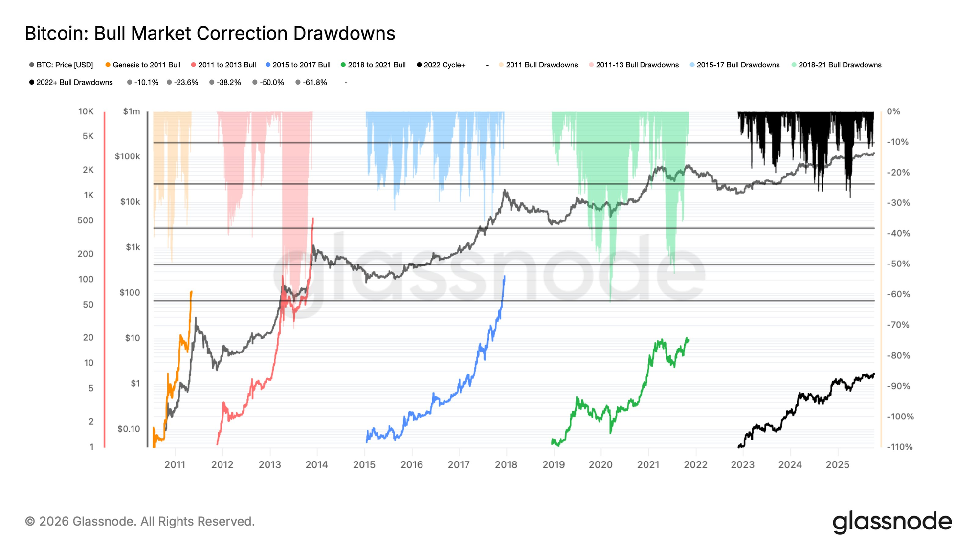 Если предположить, что достижение исторического максимума в начале октября ознаменовало конец недавнего бычьего рынка $BTC, то в этом цикле наблюдались очень незначительные просадки, как и на рынке 2015–2017 годов. | |