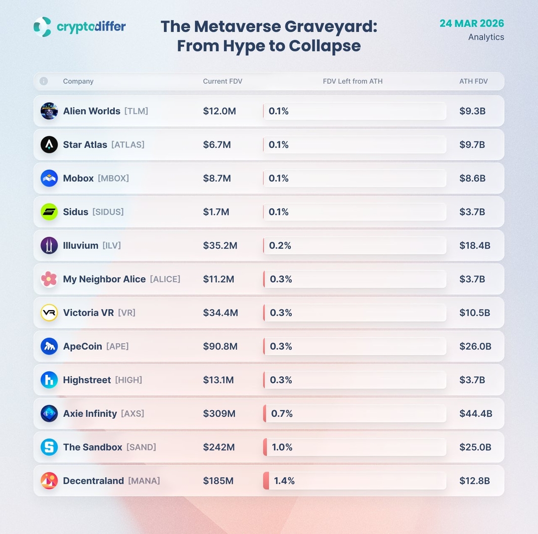 $TLM: $9,3 млрд → $12 млн (-99,9%) $ATLAS: $9,7 млрд → $6,7 млн (-99,9%) $MBOX: $8,6 млрд → $8,7 млн (-99,9%) $SIDUS: $3,7 млрд → $1,7 млн (-99,9%) $ILV: $18,4 млрд → $35,2 млн (-99,8%) $ALICE: $3,7 млрд → $11,2 млн (-99,7%) $VR: $10,5 млрд → $34,4 млн (-99,7%) $APE: $26 млрд → $90,8 млн (-99,7%) $HIGH: $3,7 млрд → $13,1 млн (-99,6%) $AXS: $44,4 млрд → $309 млн (-99,3%) $SAND: $25 млрд → $242 млн (-99,0%) $MANA: $12,8 млрд → $185 млн (-98,6%)