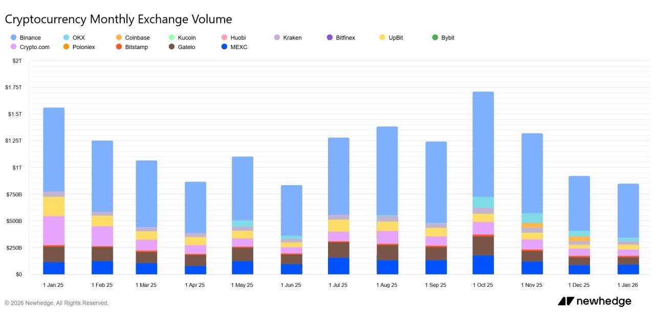Объемы торговли криптовалютами резко сократились: в январе спотовый оборот на централизованных биржах составил 1,1 триллиона долларов, что может стать самым низким показателем с июля 2025 года.