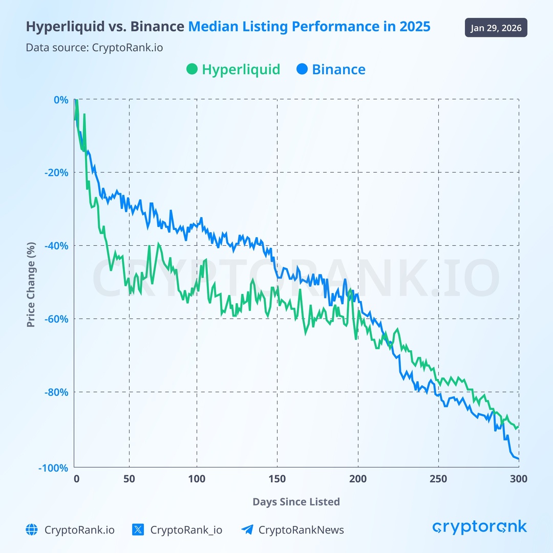 Учитывая недавнюю шумиху вокруг Binance и эффективности ее листинга, CryptoRank использовал публичные данные API Hyperliquid для сравнения результатов, и они оказались почти одинаковыми. Совершенно очевидно, что мы наблюдаем аналогичную картину на всех биржах, так что вряд ли это вина исключительно биржи. Это обусловлено появлением на рынке в 2025 году более 11 миллионов новых токенов, большинство из которых низкого качества. Возможно, 2025 год был не лучшим периодом для стратегии «купи и держи».