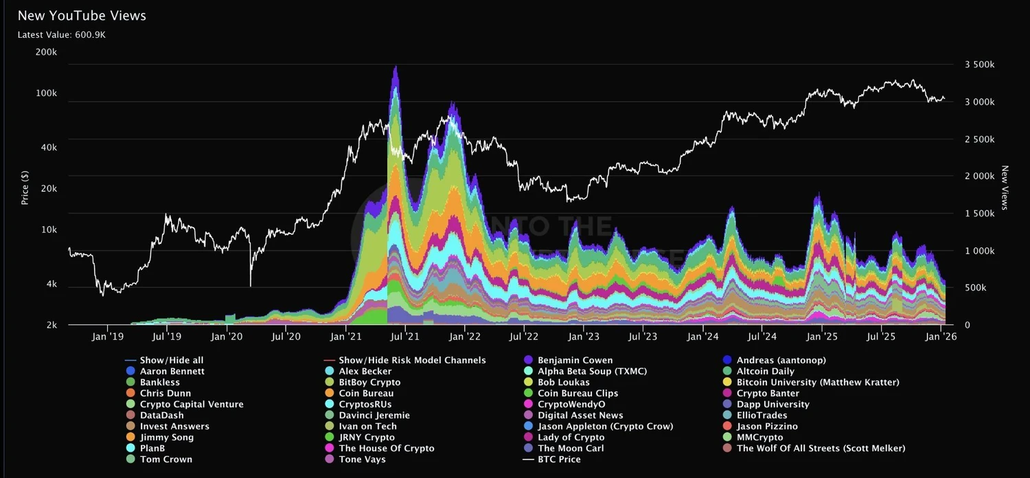 Просмотры криптовалютного контента на YouTube рухнули до минимума за 5 лет после трехмесячного спада, сигнализируя о условиях медвежьего рынка и угасающем интересе розничных инвесторов.