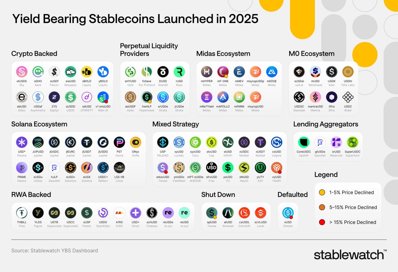 По данным Stablewatch, в 2025 году было выпущено 88 новых доходных стейблкоинов.