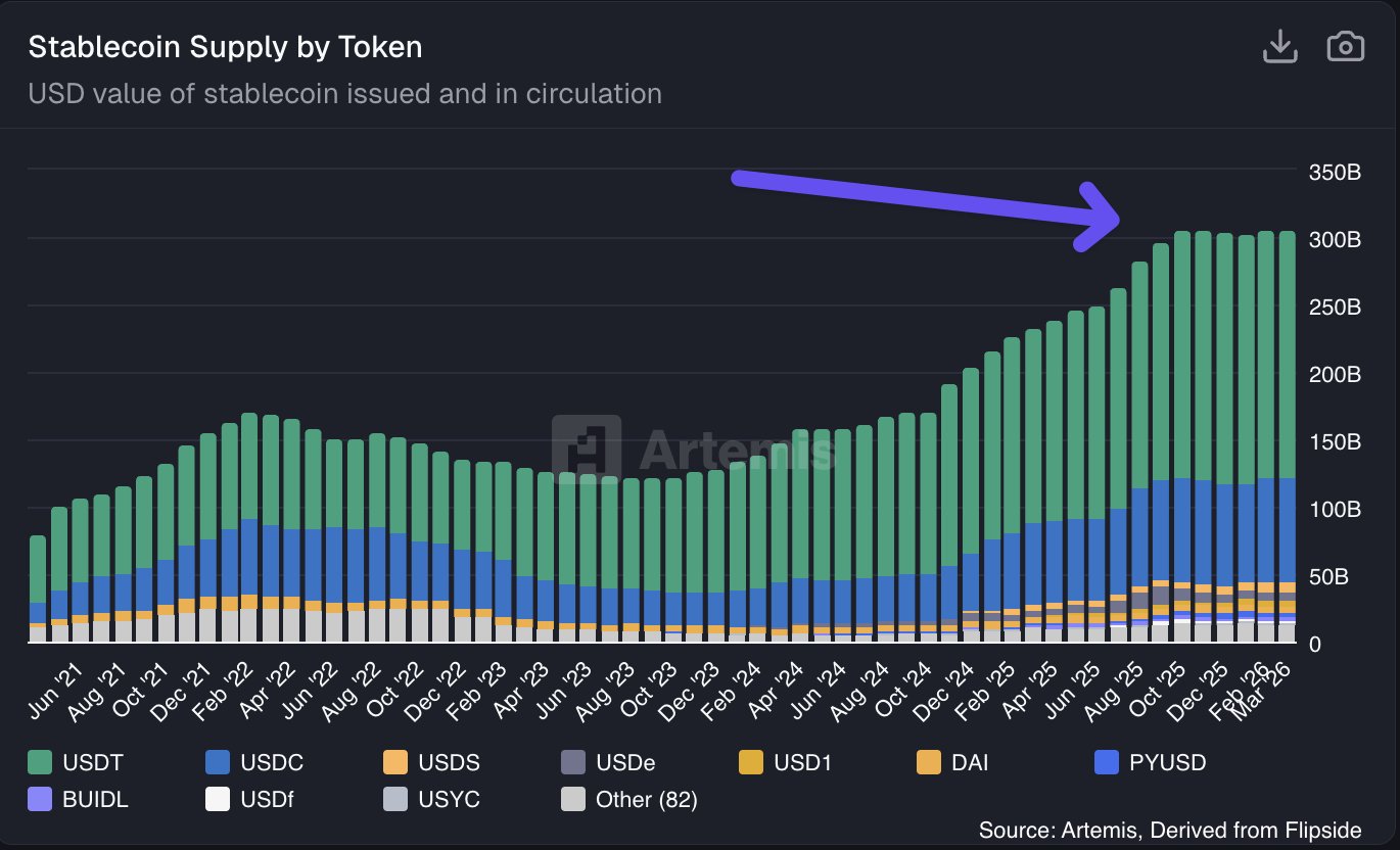 Предложение стейблкоинов не изменилось с октября 2025 года. Оно стабильно держится на уровне ~$305 млрд после роста в течение 12 месяцев подряд.