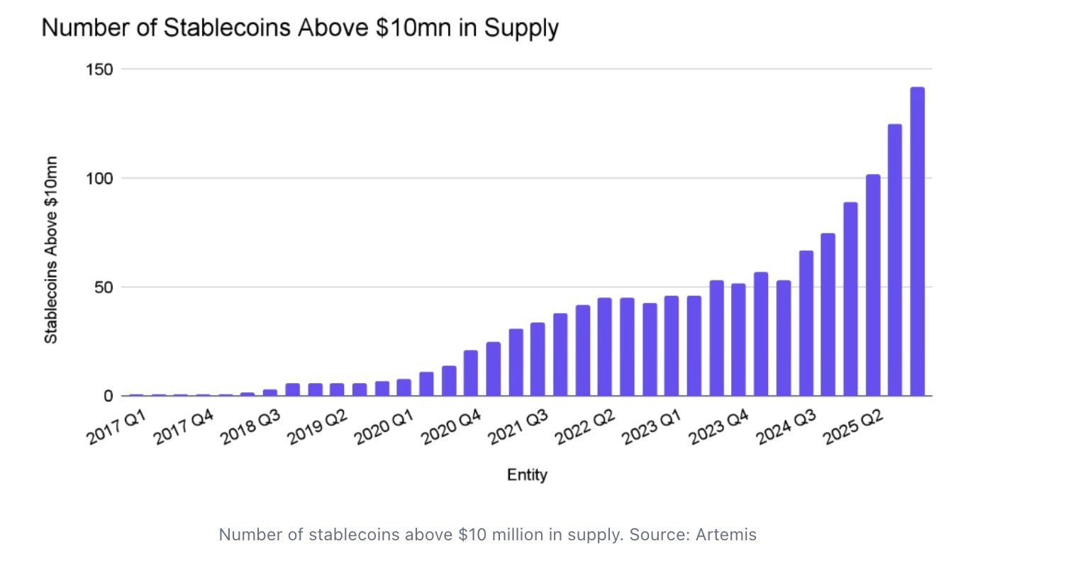 Рынок стремительно движется в сторону стейблкоинов, предназначенных для конкретных приложений, экосистем, протоколов и бизнес-моделей. Только в 2025 году количество новых стейблкоинов с эмиссией более 10 миллионов долларов увеличилось на 89%.