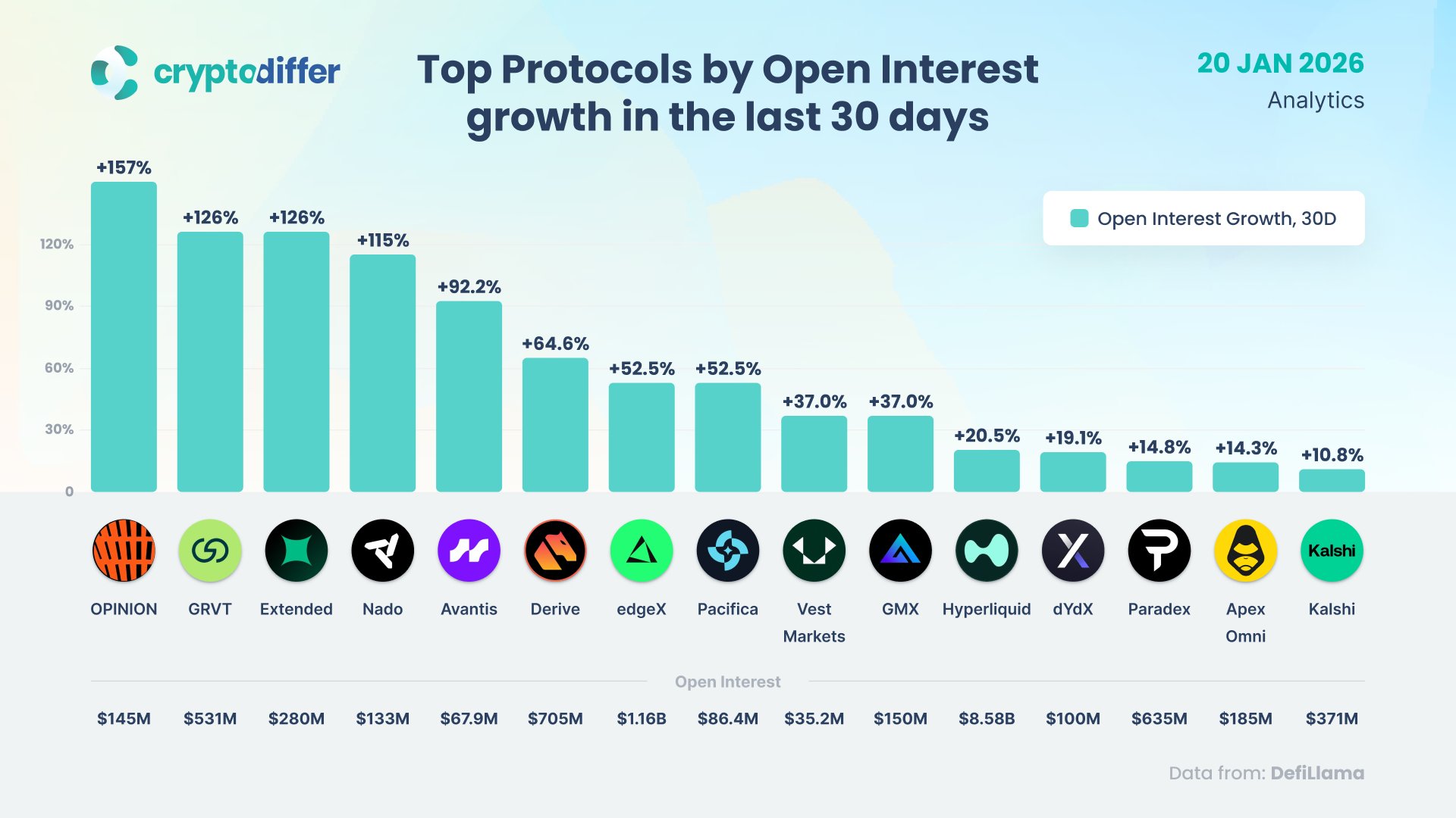 Топ-протоколы по приросту открытого интереса за последние 30 дней. Открытый интерес OI — это общая стоимость открытых позиций по деривативам, которые еще не были закрыты или урегулированы. Этот показатель отражает объем активного капитала и кредитного плеча, задействованных на рынке в данный момент. | |