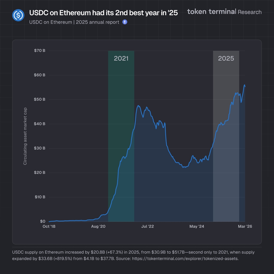 USDC на Ethereum в 2025 году показал второй лучший результат за всю историю. | |
