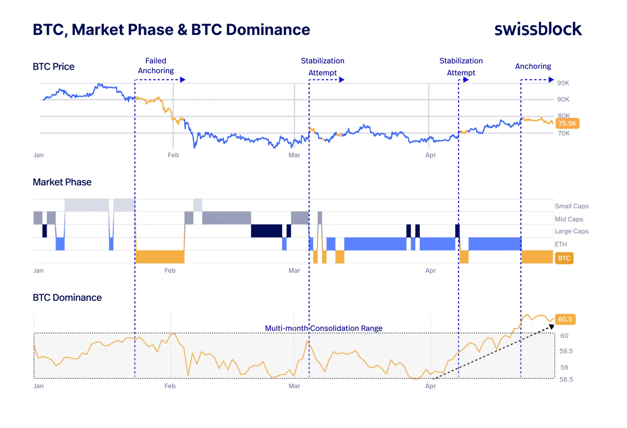 Этот сдвиг происходит как раз в тот момент, когда биткоин начинает расти, а доминирование BTC выходит за пределы многомесячного диапазона.