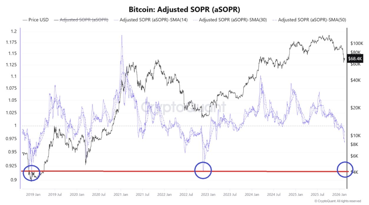 Показатель скорректированного SOPR (aSOPR) для биткоина снова опустился в зону 0,92–0,94 — уровень, который исторически отмечал основные точки напряжения на медвежьем рынке. |
