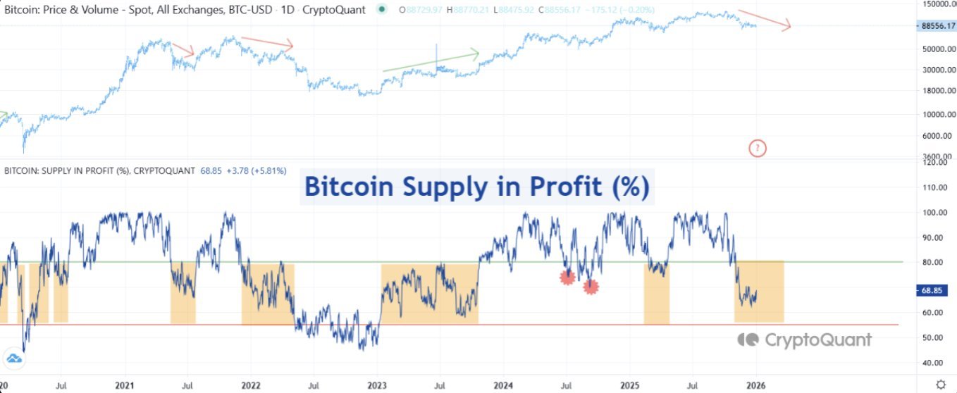 Показатель Supply in Profit (%) — это ончейн-метрика, которая измеряет долю предложения Биткоина, находящегося в прибыли. Он широко используется для оценки положения рынка внутри более широкого цикла и определения, началась ли переходная фаза. |