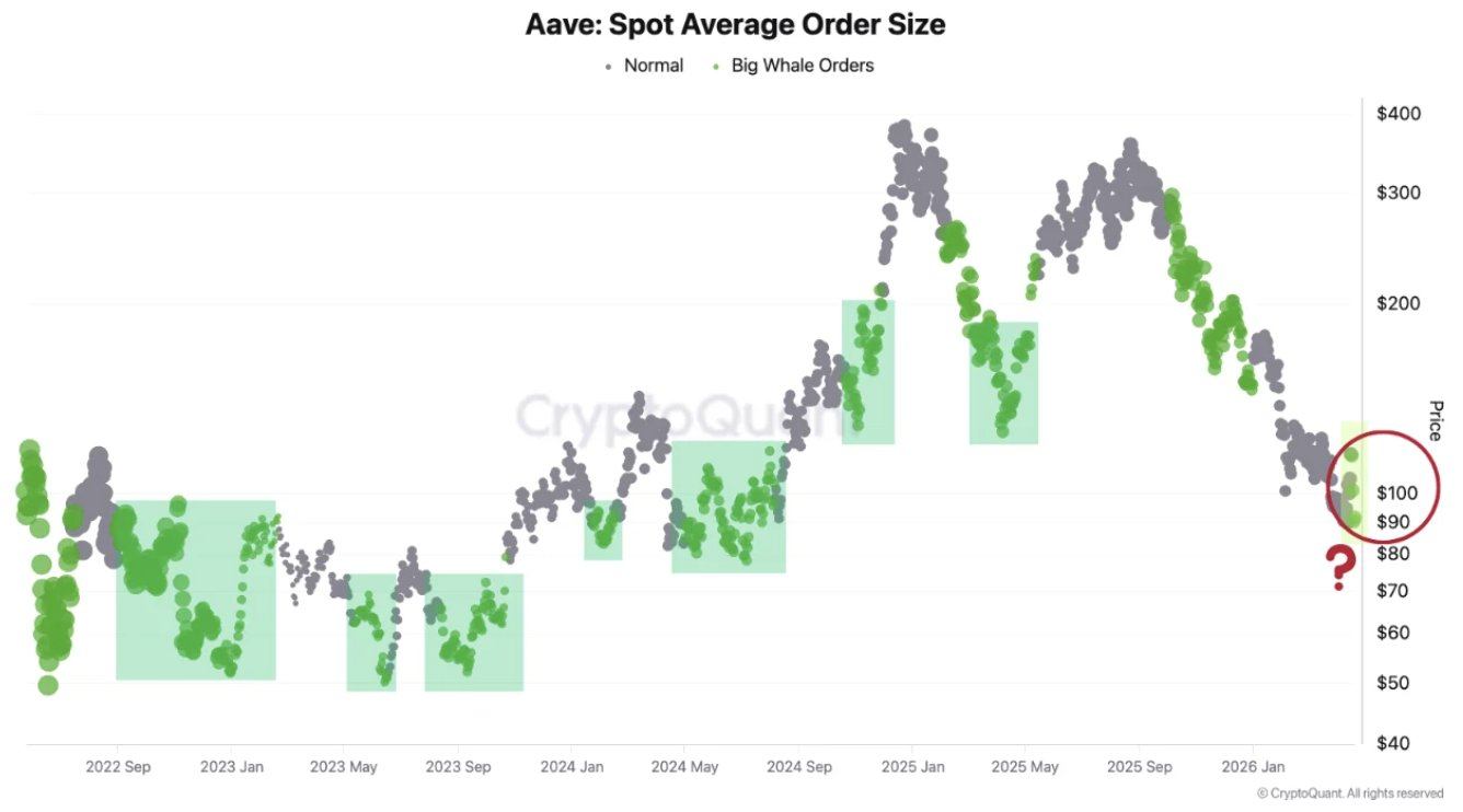 Сейчас, когда курс AAVE колеблется в диапазоне 90–100 долларов, а показатели страха близки к максимальным значениям со времен медвежьего рынка 2022 года, активность «китовых» ордеров снова резко возросла. На графике она отмечена знаком «?», поскольку исход еще неясен.