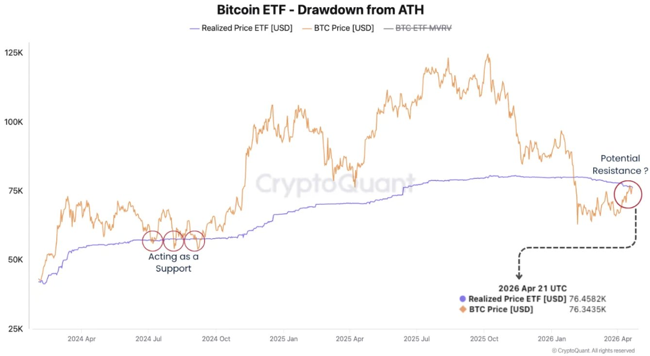 По состоянию на 21 апреля реализованная цена биткоин-ETF составляет ~76 400 долларов, что почти идентично текущей спотовой цене в 76 300 долларов. Эта группа инвесторов находится в минусе с 30 января и несет нереализованные убытки уже почти три месяца. Впервые с тех пор они приближаются к точке безубыточности, что создает психологически напряженную ситуацию.