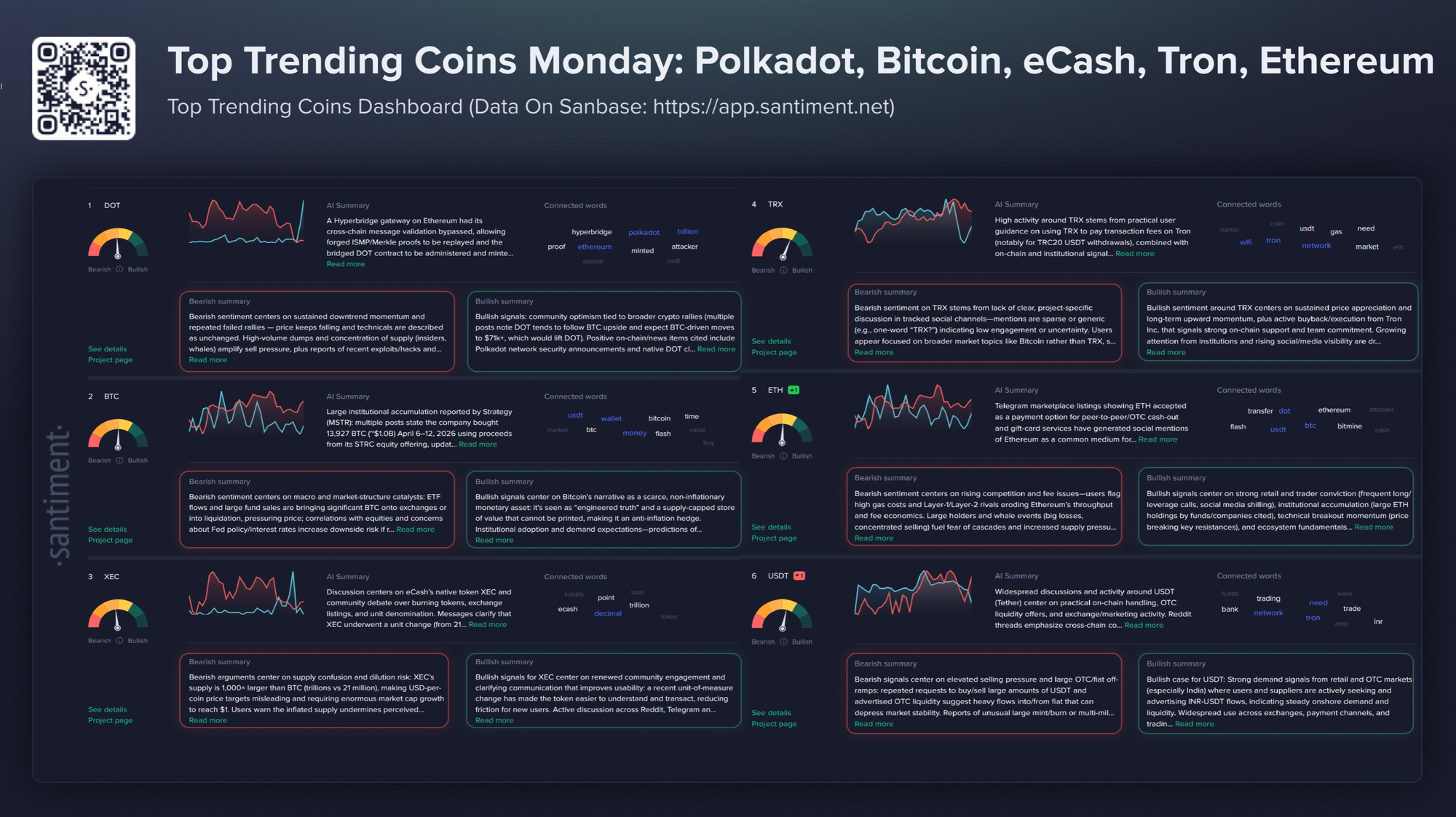 • Tron $TRX: высокая активность вокруг TRX связана с практическими рекомендациями для пользователей по использованию TRX для оплаты комиссий за транзакции на Tron (в частности, при выводе TRC20 в USDT), а также с ончейн- и институциональными сигналами: ежедневными сообщениями о покупках со стороны Tron Inc., увеличивающих ее долю в TRX, новыми интеграциями с DeFi (потоки данных о ценах от оракула WINkLink), рекламными акциями, связанными с Джастином Саном (активные предложения TRX Earn), конфликтом в социальных сетях с конкурирующим токеном WLFI, а также включением TRX в список активов, рассматриваемых Grayscale во втором квартале 2026 года. В социальных сетях пользователи рассказывают о низких комиссиях за TRC20, дают пошаговые инструкции по выводу средств и использованию кошельков (в том числе советуют оставлять небольшой баланс TRX для оплаты газа и тестовых переводов), комментируют торговлю и динамику цен, а также обсуждают показатели экосистемы, такие как предложение и займы.